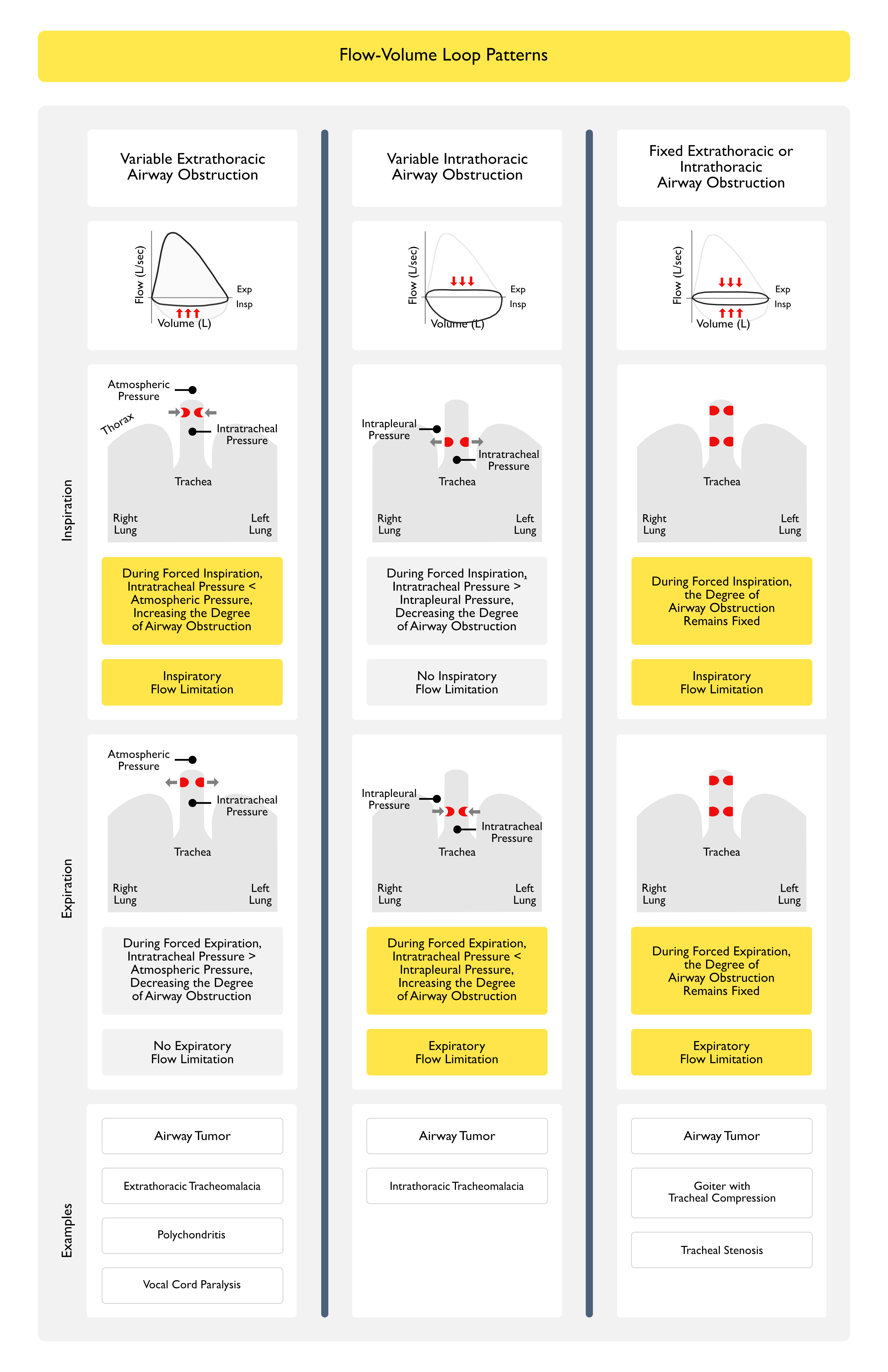 - Variable Extrathoracic Upper Airway Obstruction: adversely affects predominantly inspiratory flow (as inspiratory negative intraluminal pressures exacerbate the inspiratory airway narrowing, while expiratory positive intraluminal pressures splints the obstruction open)