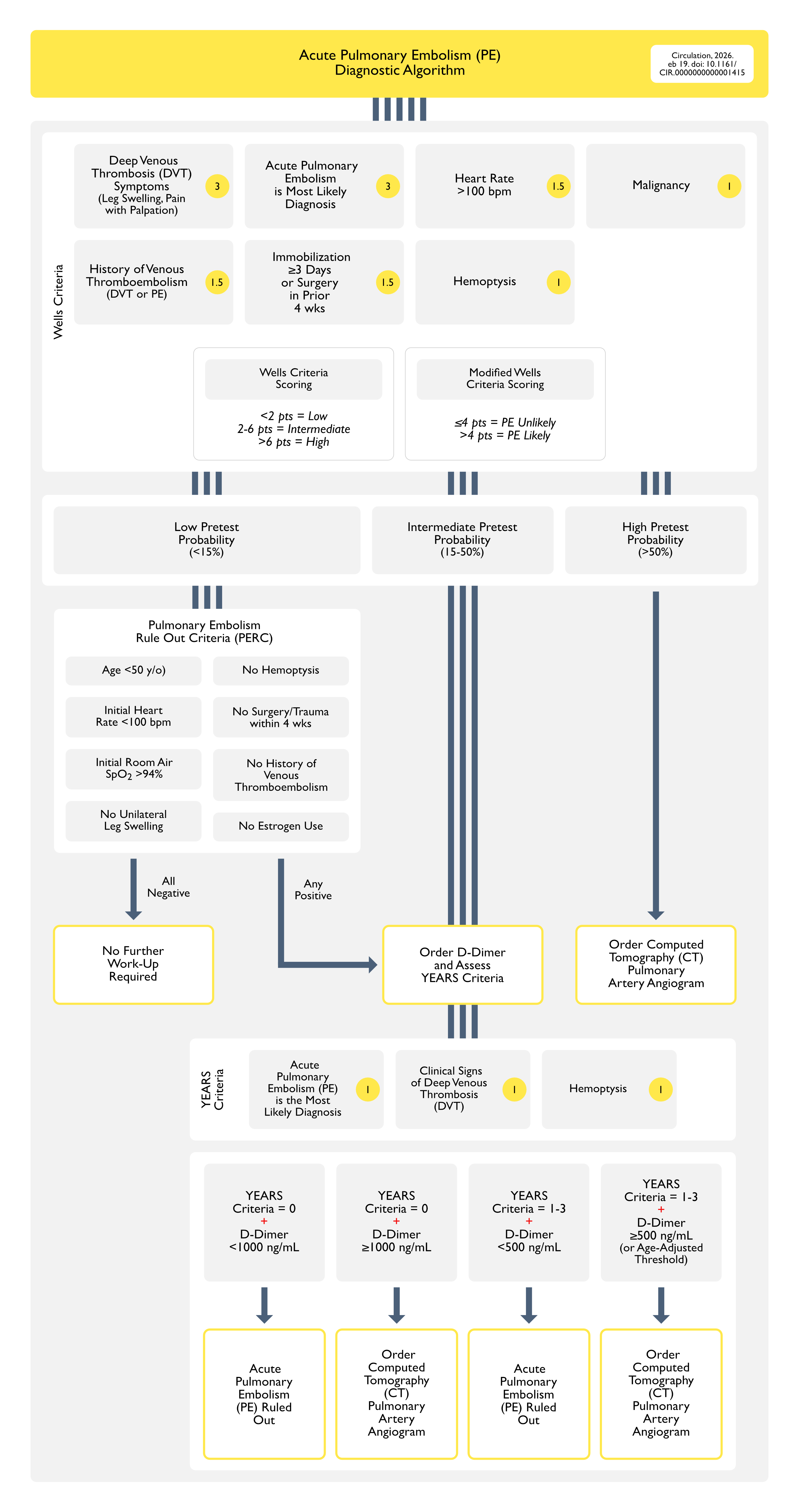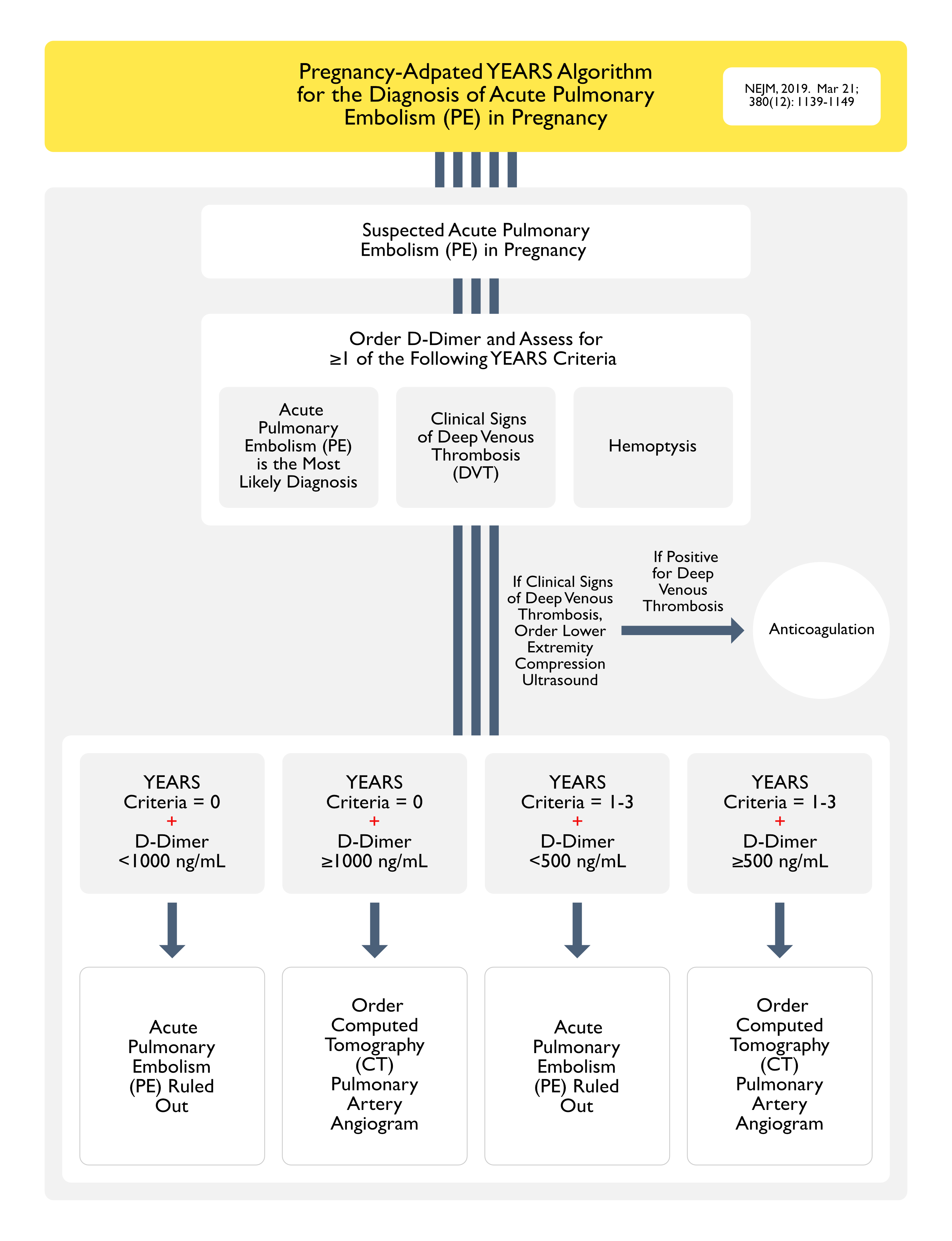 Wells Criteria ≤4: providers were recommended to initially use D-dimer testing (since the probability of acute PE is low in this population, if D-dimer level is normal)