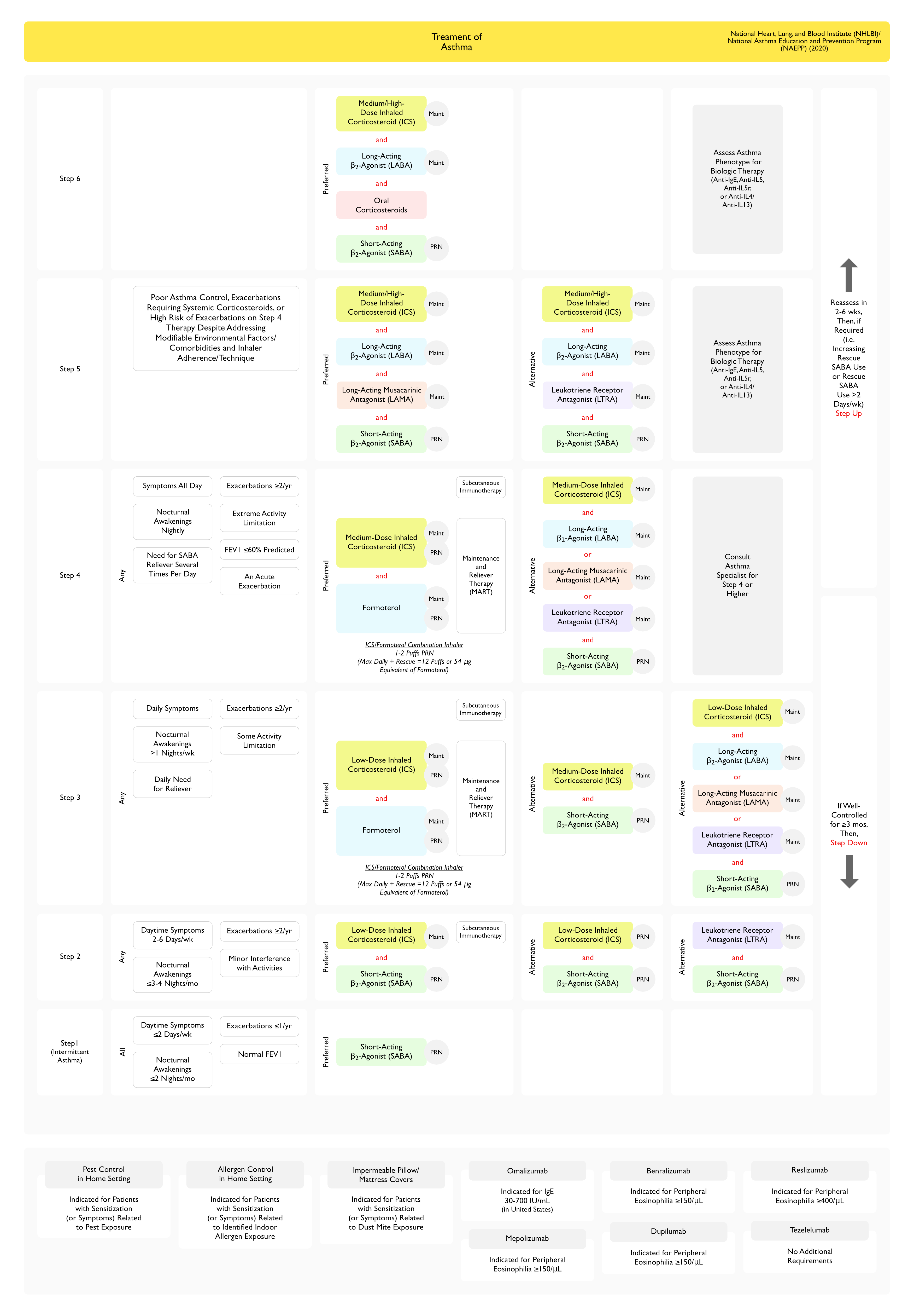 - In the setting of improved control on an inhaled steroid and other agents, stepping down the dose of inhaled steroid is preferred to minimize the potential complications (including adrenal suppression, cataracts, osteoporosis, growth rate
